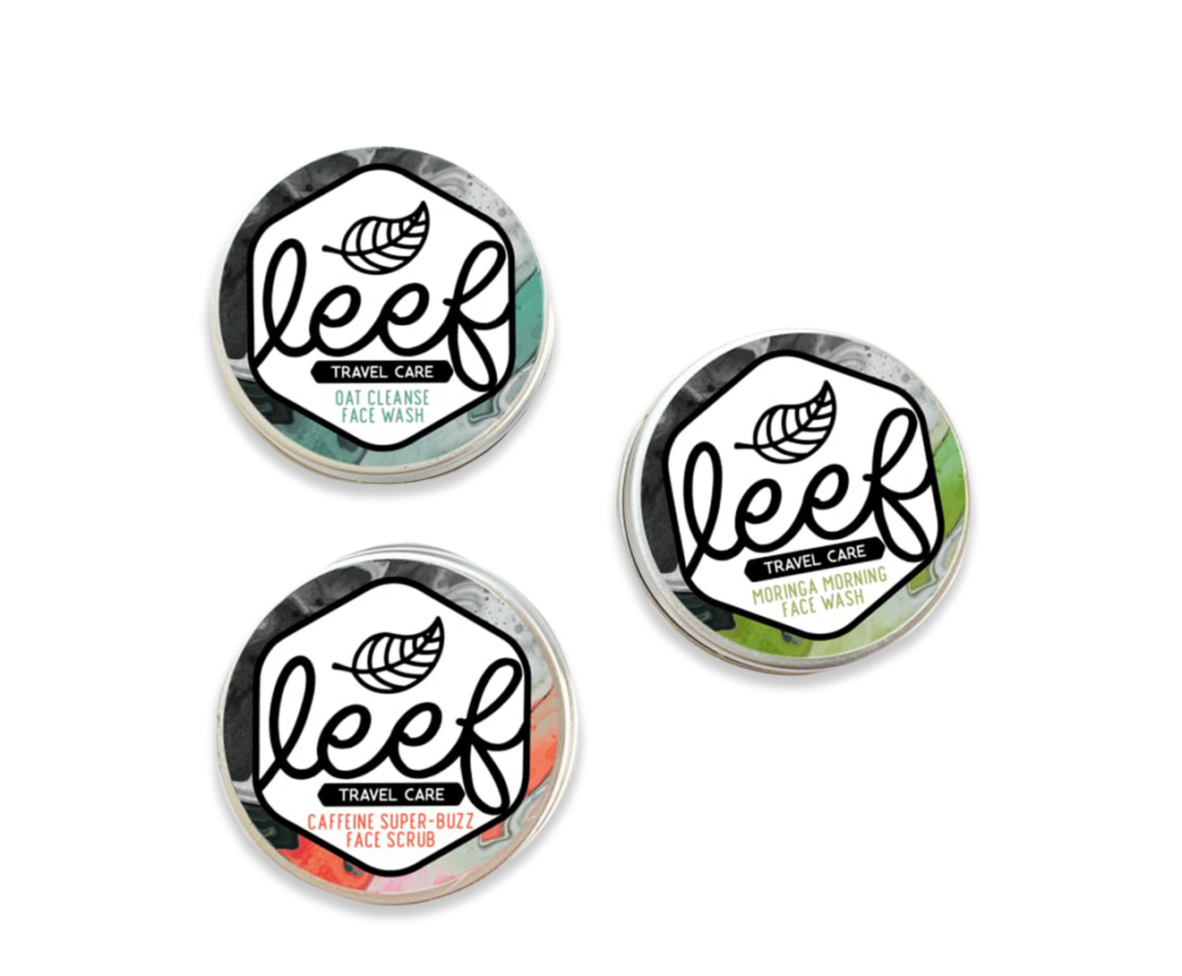 The whole family is here! Our original, the OG, Oat Cleanse Face Wash, Vitamin C Powerhouse Moringa Morning and Caffeine Boosted Super-Buzz Face scrub in Mini Travel-Friendly Sizes that won't leak or spill in your pack.All Leef Travelcare face washes and scrubs are powered by organic oats, linoleic acid-rich safflower oil, shea butter & hemp seed oil leaving your face feeling soft and fresh.